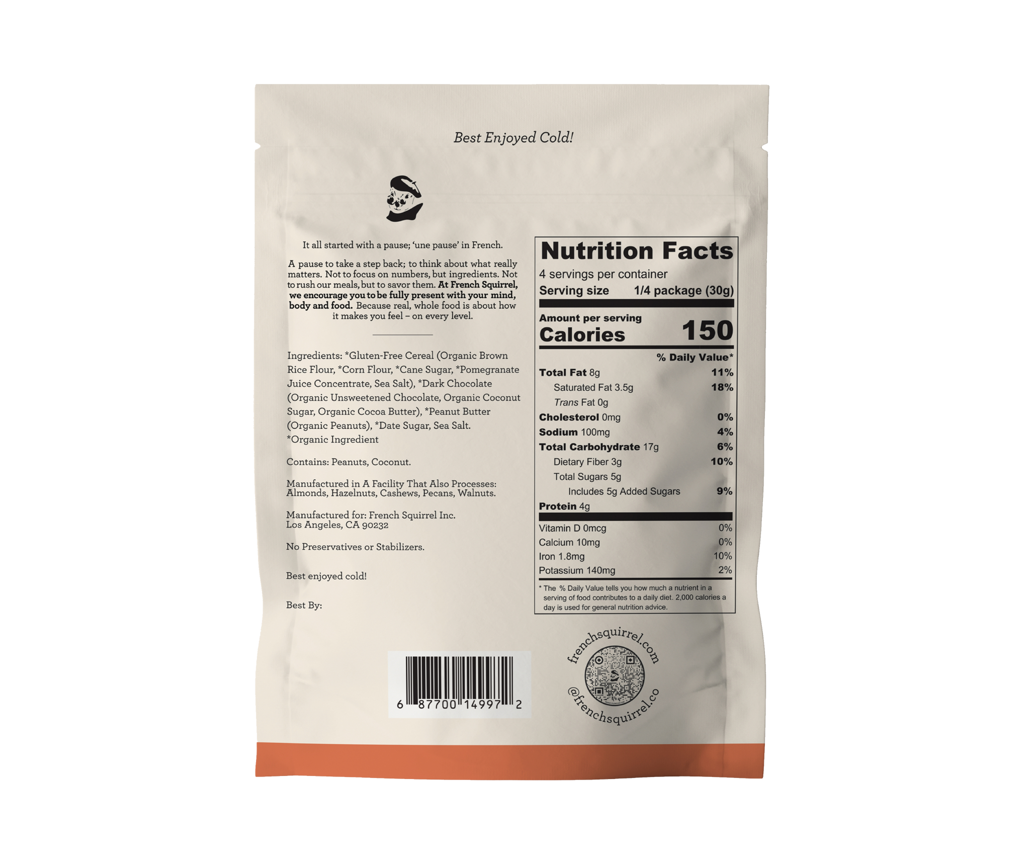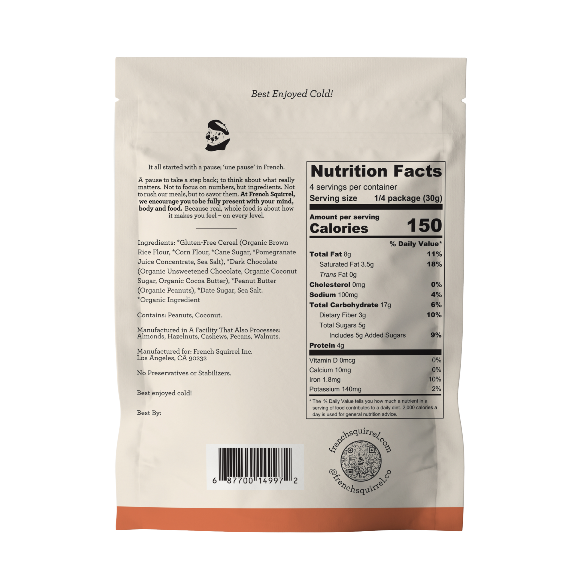 French Squirrel Bisous: Peanut Butter & Chocolate-Coated Gluten-Free Cereal Clusters Bag - 4 Bags case — with summer heat, we ship with insulation and ice packs to keep your French Squirrel sweet snacks fresh and delicious ️ this adds a bit to shipping, but it’s worth it! Please ensure someone’s home to bring us inside upon receipt. Merci beaucoup!