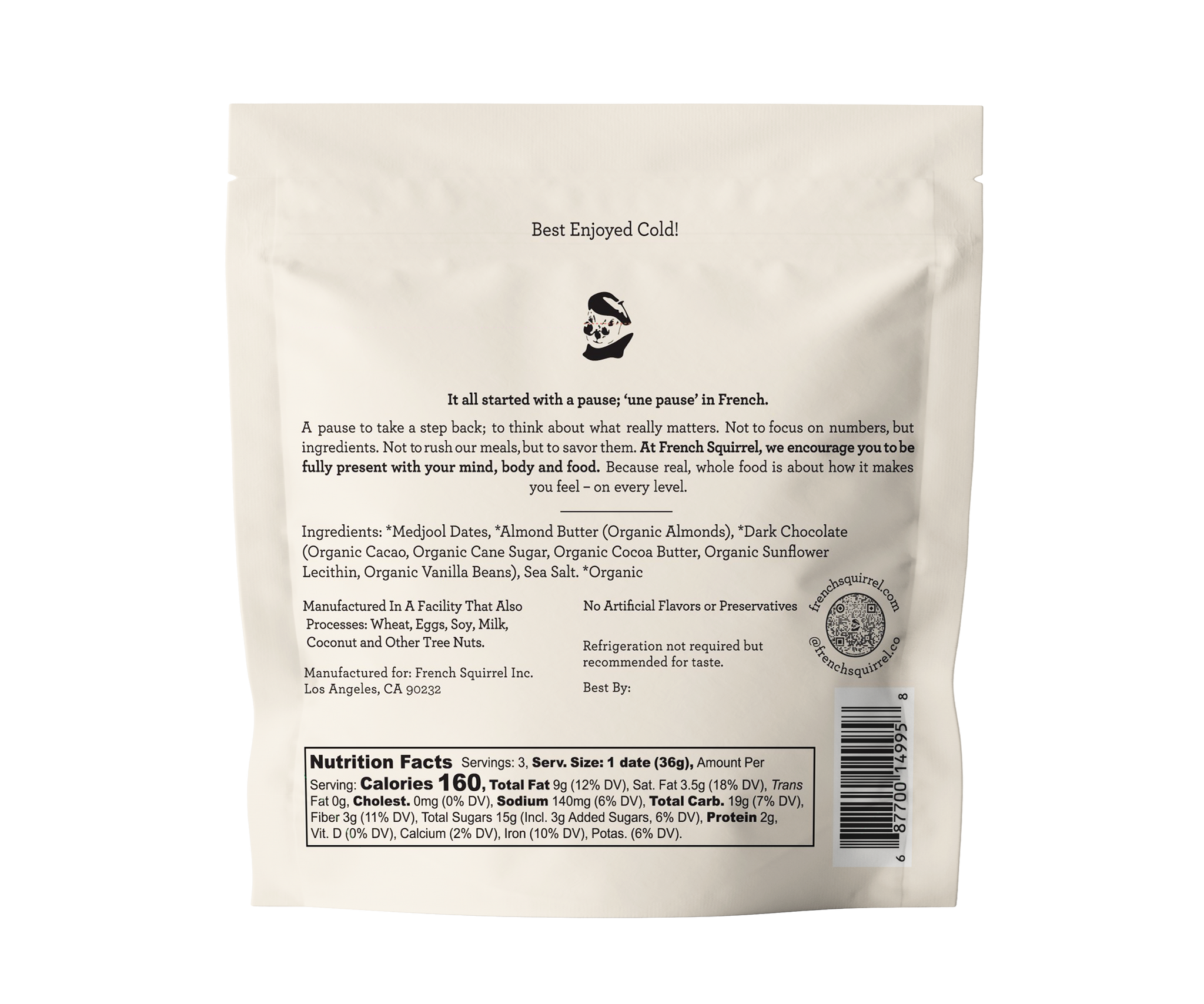 French Squirrel Bateaux: Almond Butter Dark Chocolate Stuffed Dates Bag - 4 Bags case summer heat, we ship with insulation and ice packs to keep your French Squirrel sweet snacks fresh and delicious ️ this adds a bit to shipping, but it’s worth it! Please ensure someone’s home to bring us inside upon receipt. Merci beaucoup!