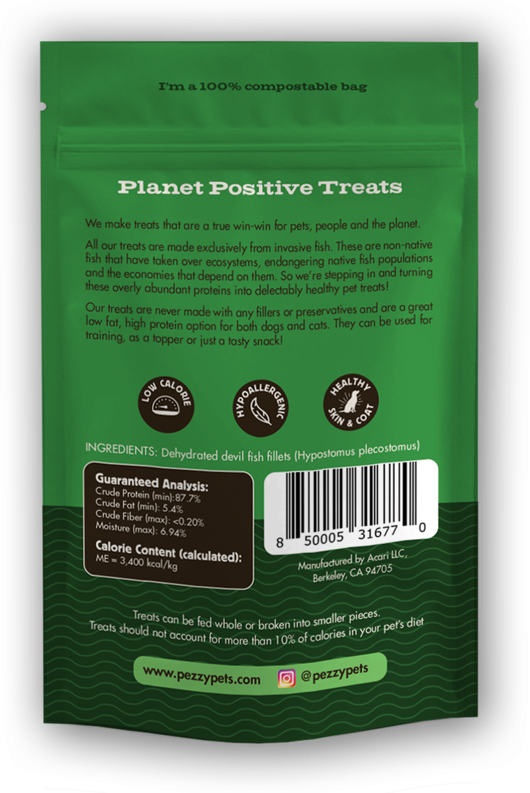 Pezzy Pets Slabs Whole Fish Fillet Bag Slabs are whole fish fillets slowly dehydrated, creating the perfect crunchy treat! Pezzy Pets Slabs Whole Fish Fillet use the same wild-caught invasive Mexican devil fish as our fish strips but leave these fillets whole for a heartier treat for bigger dogs. Pezzy Pets Slabs Whole Fish Fillet single ingredient treats are just that! Fish and nothing else. Pezzy treats are high in protein and low in calories, making sure your furry friend stays healthy and lean.