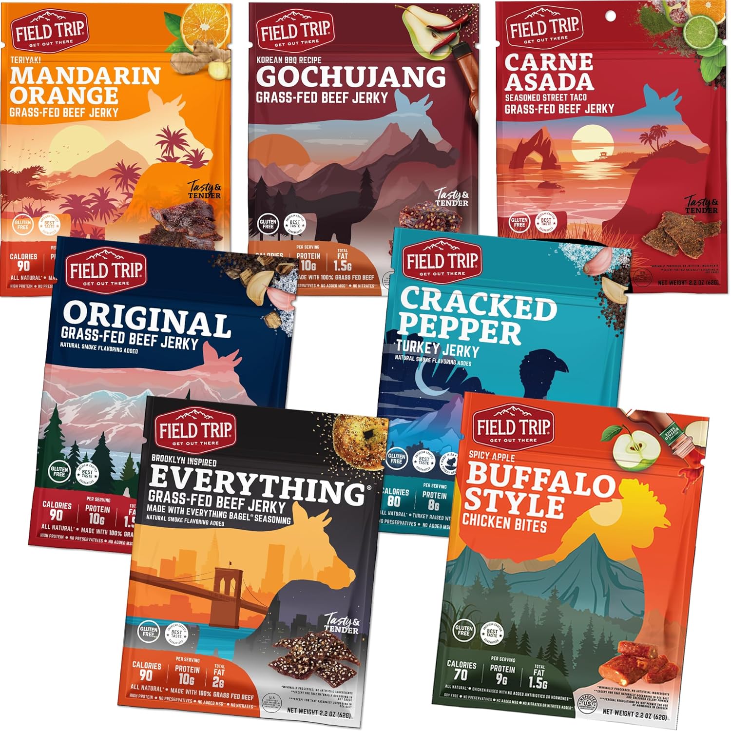 Our fan favorite variety of Jerky: Carne Asada (Beef Jerky), Everything Bagel (Beef Jerky), Gochujang (Beef Jerky) and Mandarin Orange (Beef Jerky). A great place to start in the Field Trip universe.