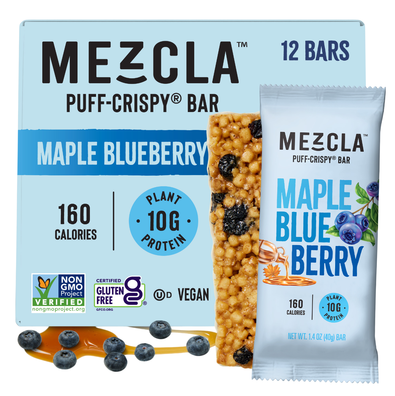 Mezcla Maple Blueberry Bars - 12 bars x 1.4 oz case let’s you take your tastebuds out to brunch! Mezcla Maple Blueberry Puff-Crispy Bar features sweet blueberries, mapley vanilla drizzle, and all the joy of a blueberry pancake on Sunday morning.