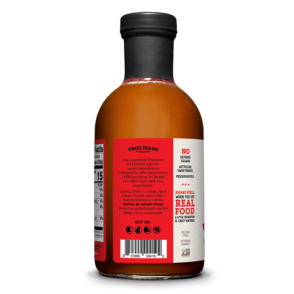 Legendary Pitmaster Ed Mitchell is from Eastern NC, but he still appreciates the “Red” Sauce served in the Western part of the state, like in Lexington, NC. On that side of the state, Bar-B-Q is made from pork shoulder and the sauces use tomatoes, hence, “Carolina Red.” This authentic Red is tangy and spicy with a touch of sweetness from apples, butternut squash, and carrots. Loaded with American-grown fruits and vegetables, heritage, and zero added sugar, it’s the recipe for how we used to eat.