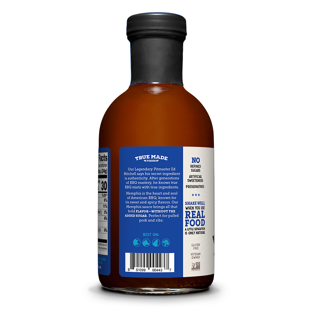 True Made Pitmaster Memphis Sweet BBQ Sauce Bottle - 6 bottles case. Memphis is the crossroads of American barbecue. African-Americans immigrated to Memphis for jobs from all over the South in the early 20th Century and they brought their different styles of BBQ with them, merging, like the Blues that came out of Memphis, into its own unique, regional style.