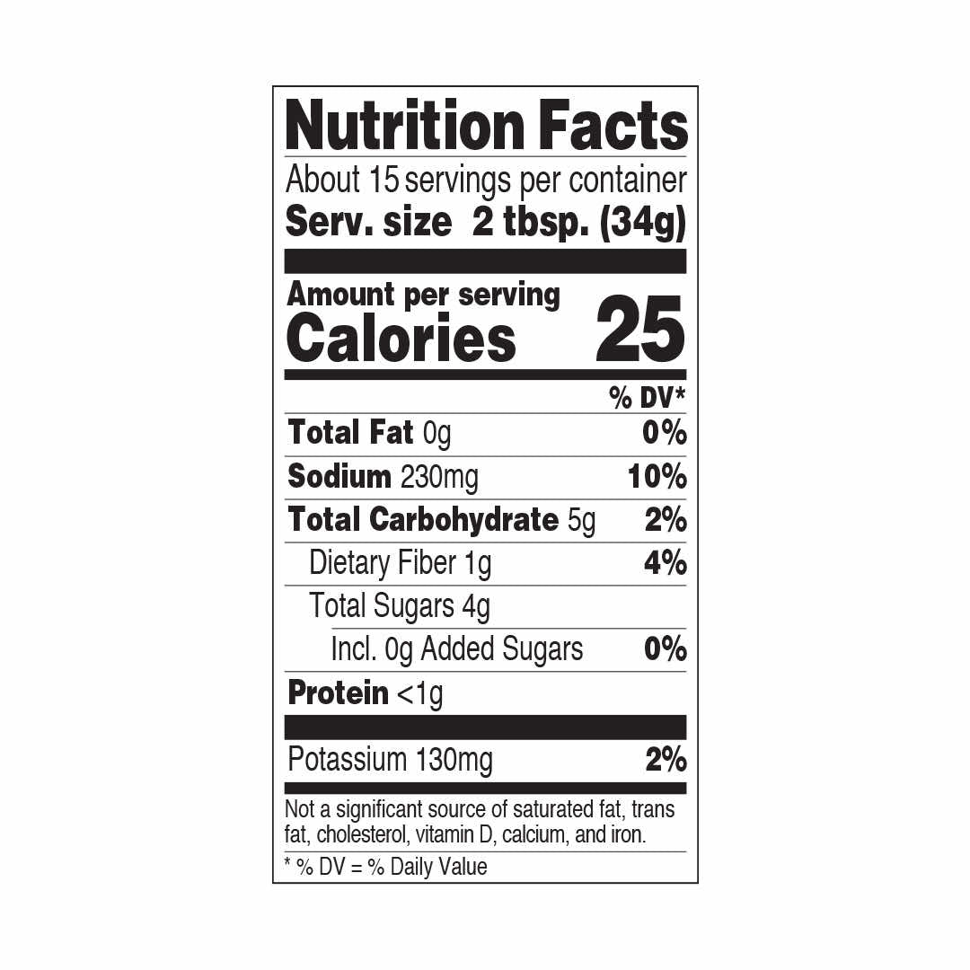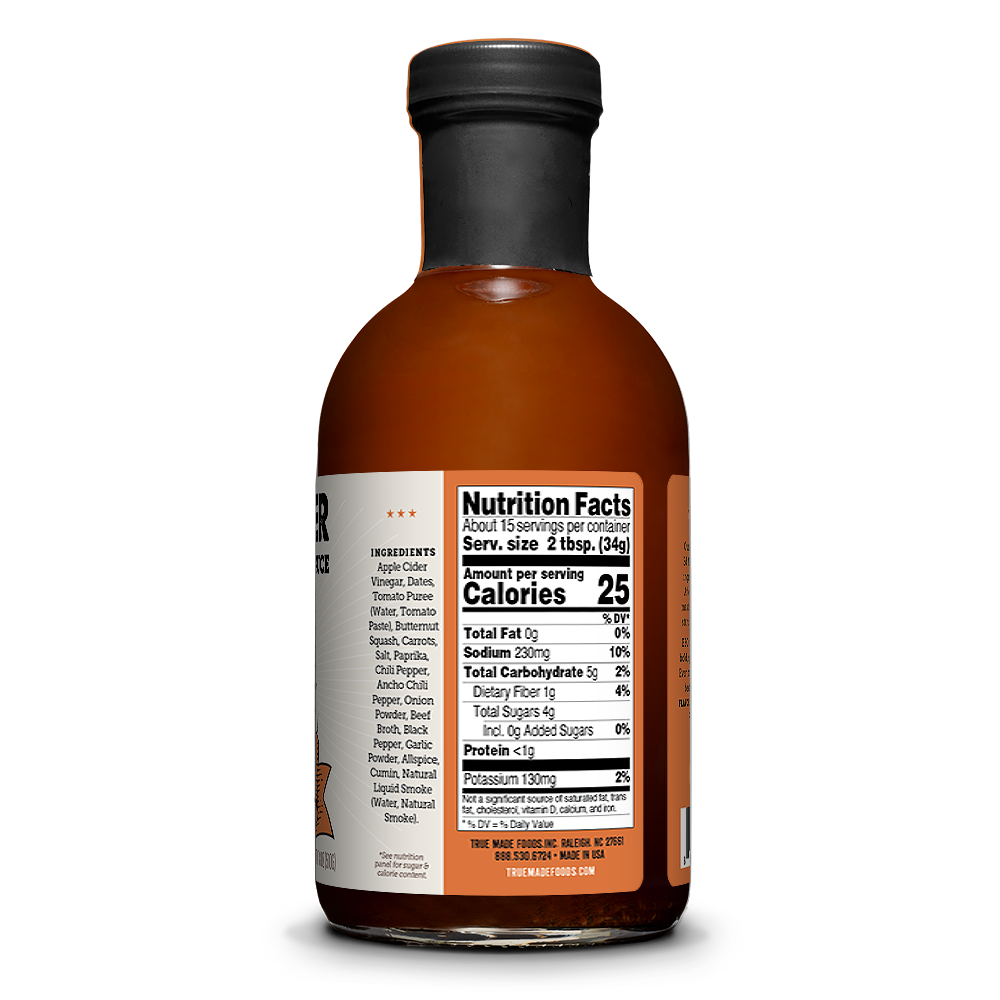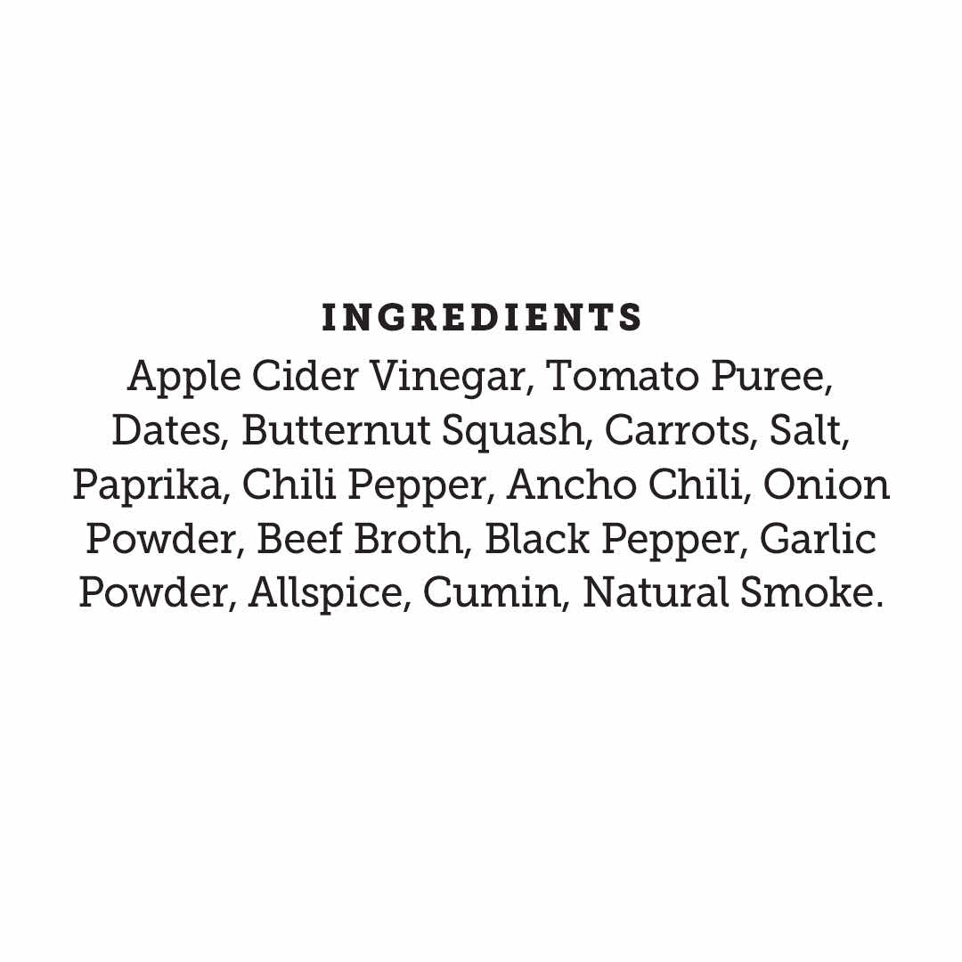 Ingredients: Apple Cider Vinegar, Dates, Tomato Puree (Water, Tomato Paste), Butternut Squash, Carrots, Salt, Paprika, Chili Pepper, Ancho Chili Pepper, Onion Powder, Beef Broth, Black Pepper, Garlic Powder, Allspice, Cumin, Natural Liquid Smoke (Water, Natural Smoke)