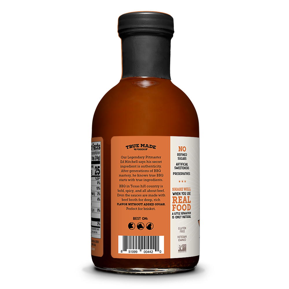 Like Texas, real Texas barbecue is bold, not sweet. A long history of cattle herding formed Central Texas’ barbecue roots around beef, and the sauce followed suit. Legendary Pitmaster Ed Mitchell makes our Central Texas-style BBQ sauce using authentic techniques based on the traditions of the region. We use beef broth, regional spices, like cumin and ancho powder, and American-grown vegetables for homegrown flavor. This bold and spicy blend was made for brisket, burnt ends, and any other beef dish that could use a dollop of Texas-sized flavor.